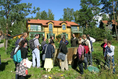International Visitors to ecological village near Stockholm, all 200 houses have urine-diverting toilets; the participants are looking into the urine-storage tanks. Tour oragnised by Varna AB.