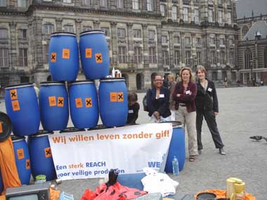WECF chemicaliënberg om aandacht te richten op het probleem dat consumentenproducten gevaarlijke chemicaliën bevatten. De vrouwen hebben een muur van vaten en consumentenproducten gebouwd waaruit gif lekt. Op het spandoek staat: “wij willen leven zonder gif. Een sterk REACH voor veilige producten”.