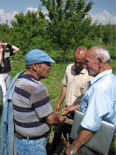 Agriculture expert Manuk Harutyunyan (right) with farmers in their orchard