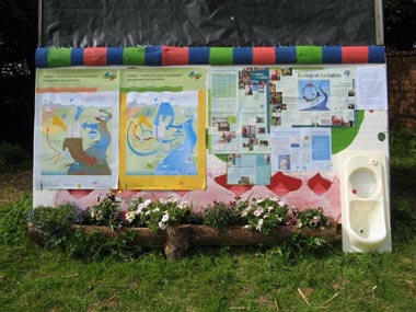 Adam became interested in the WECF experience of building urine-diverting (Ecosan) toilets when he was directed to this website and then requested copies of posters and leaflets. The display on ecological sanitation, made out of GTZ posters, WECF information, other published materials and even a sample of the UD squatting slab, were presented on the side of an A frame toilet (see pictures). This was rather an obvious and direct case of ‘theory and practice’! It is hoped that the toilets, urinals and the display material will develop in the years ahead, with many thousands becoming educated in alternatives to the standard Water Closet (WC).