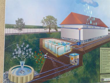 The water is collected from the roof of an old building in the school yard which after a renovation from Varna municipality will become a gym for the pupils. After collecting the water, it goes into underground reservoirs where is filtered and by the help of a pump part of the water goes for watering the garden and part of the water goes into a small pond.