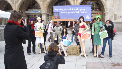 Auf dem Gebiet nachhaltige Landwirtschaft und gesunde Lebensmittelherstellung weist die Installation auf dem Marienplatz auf die Gefahren der grünen Gentechnik und des Verlustes der Arten- bzw. Sortenvielfalt im täglichen Leben hin. Gerade die große Sortenvielfalt der traditionellen Landwirtschaft hat jahrhundertelang unsere Ernährung gesichert. Die Schaffung und der Erhalt dieser so genannten Agro-Biodiversität liegt seit jeher in den Händen der Frauen, da sie verantwortlich für die Ernährung ihrer Familie und die Vermehrung des Saatguts sind. Umweltzerstörung, Monokulturen, Patente auf Pflanzen und Tiere sowie gentechnisch verändertes Saatgut gefährden nicht nur diese Vielfalt. Vielmehr führen sie zu Abhängigkeiten und gefährden im schlimmsten Fall – vor allem in ärmeren ländlichen Regionen – die Nahrungsmittelsicherheit. Da in vielen Kulturen Frauen und Kinder traditionell erst nach den Männern zu essen bekommen, sind sie die ersten, die unter dem Mangel zu leiden haben. WECF fordert und fördert unter anderem das Verbot des Anbaus von genmanipulierten Pflanzen zum Erhalt der Agro-Biodiversität und zum Schutz der menschlichen Gesundheit.