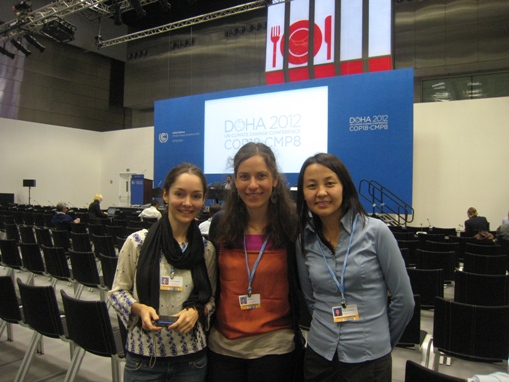 WECF works closely with the Women and Gender Constituency and Climate Action Network (picture: WECF Safe Energy and Climate Change Coordinator Sabine Bock and WECF members Katia Uspenskaya, Friends of the Baltic Russia and Nurgul Esemanova, Unison Kyrgyzstan, at the conference center in Doha, Quatar.