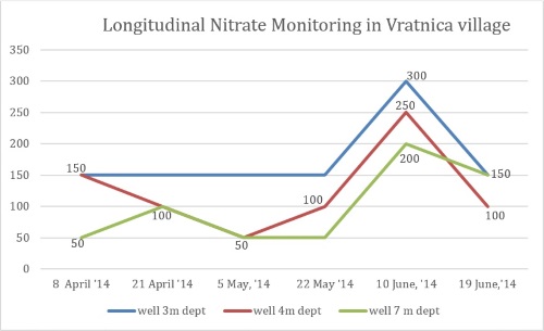 Results of 3 months nitrate monitoring of 3 water sources in Vratnica. In Vratnica the schools targeted 11 wells in the private property and a 1 public well in the middle of the village, as well the tap water placed in the primary schools.