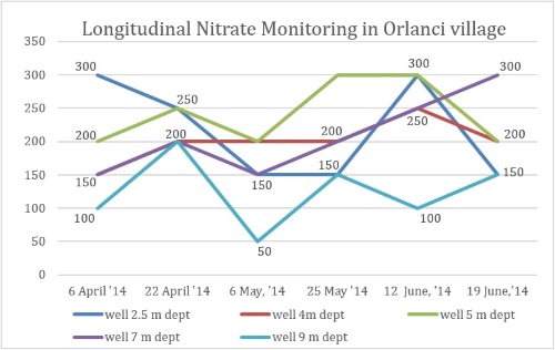 Results of 3 months nitrate monitoring of 4 water sources in Mojance.In Mojance registered 9 wells in the private property and a 2 public well in the middle of the village were identified by the school.