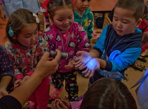 In the „N2“ and „Bakyt“ kindergarden the children listen quietly while Ainura and the Aqua Planet team are making the germs on the children’s hands visible with glitter powder and blue light and then showing them that washing your hands in the right way is the way to get rid of those germs. The kids are suprised and some even need a couple of washings to be germfree. A catchy „Handwashing Song“ afterwards makes for a perfect ending to an exciting day for Bokonbaev’s preschoolers.