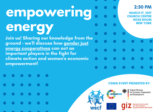 Then you are warmly welcome to join our Committee on the Status of Women (CSW61) side event “Empowering Energy: Gender Just Energy Cooperatives” at 2:30pm, March 17, Boss Room, Church Center, UN, New York.