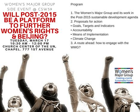 Organized by the Women's Major Group, this event will outline the key advocacy asks and women's perspectives on a truly transformative post-2015 development agenda. The event will also highlight key opportunities for engagement in the activities of the WMG.