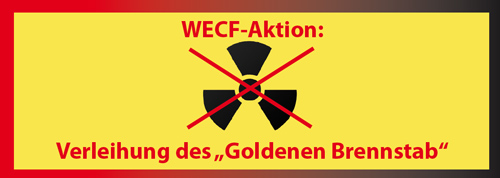 Mit dem Goldenen Brennstab des Monats prämiert die Umwelt- und Frauenorganisation WECF (Women in Europe for Common Future) jeden Monat eine Person öffentlichen Interesses für einen herausragenden Ausspruch zum Thema Kernenergie.Nicht erst seit dem Wahlkampf und den schwarz-gelben Koalitionsverhandlungen ist die Kernkraftnutzung wieder verstärkt Streitpunkt der öffentlichen Debatte. Ob Klimaretter oder Ökoenergie genannt, die Kernenergie wird von zahlreichen Politikern und Industriellen als geeignete Energiequelle der Zukunft angepriesen.
