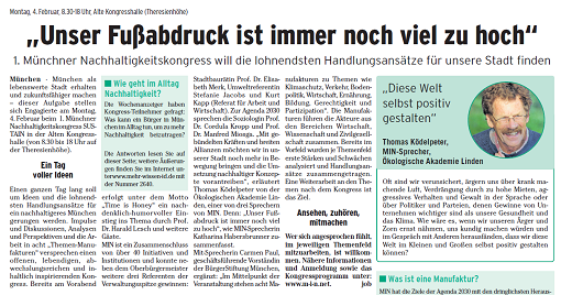 Unter dem Motto "Respekt (vor der Umwelt)" erschien am vergangenen Samstag im Wochenanzeiger ein Artikel zum Thema Nachhaltigkeit. Genauer ging es dabei um Ratschläge von TeilnehmerInnen des 1. Münchner Nachhaltigkeitskongresses, wie man seinen Alltag konkret nachhaltiger gestalten kann. Aussagen von MIN-SprecherInnen oder Beschäftigten der Stadt geben dabei einen umfassenden Überblick für verschiedene Handlungsansätze.