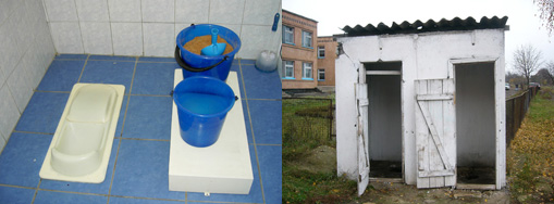 Urine Diverting School Toilet in Hayanist, Armenia; Old school latrine in Gozhuli, Ukraine.