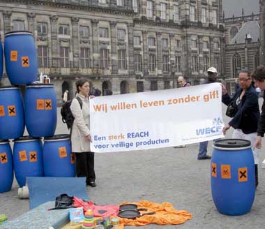 WECF chemicaliënberg om aandacht te richten op het probleem dat consumentenproducten gevaarlijke chemicaliën bevatten. De vrouwen hebben een muur van vaten en consumentenproducten gebouwd waaruit gif lekt. Op het spandoek staat: “wij willen leven zonder gif. Een sterk REACH voor veilige producten”.