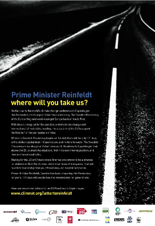 The Swedish Presidency of the EU starts at 1 july 2009. WECF signed the ad below which calls on Prime Minister Reinfeldt to design and champion an EU Roadmap to Copenhagen that allows the EU to break the deadlock in controlling climate change, first in its own international position, and then in international talks.