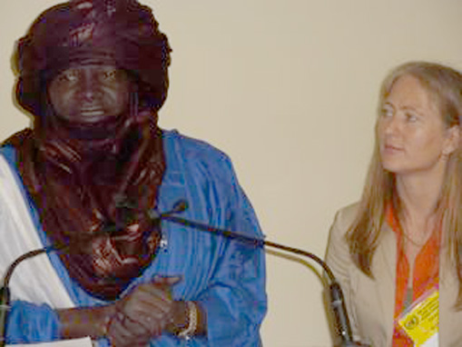 Almoustapha Alhacen, a mining worker from the Touareg tribe and President of the NGO Agrhirin'man for the protection of the environment and wellbeing, outlined the situation of the Tuareg tribes in Niger and the negative impacts of uranium mining activities of French nuclear operator AREVA on the local environment and peoples. Since 1968 the company has been exploiting uranium in Niger. Alhacen himself started working in the mines nearby the town Arlit 20 years ago. He said that his people were told that uranium mining will help them to overcome poverty. „In reality hundred thousands of tons of uranium have been mined so far, but we still have no covered streets, no clean drinking water and no electricity and children are playing in radioactive dust". Many miners suffer severe health effects. Women have problems with pregnancies, illnesses seem to be given from one generation to the next. The million year old fossil water sources are being depleted for the mining process, the plants and trees wither, the waste water coming back is low radioactive. Animals and plants disappear.