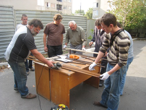 Supported by the German expert Markus Brandhofer as well as local expert Sergey Vykhrystyuk (Vidrodzhennia) participants succeed to build a solar collector using only local materials available in Odessa. The costs of the solar collector turned to be comparable with the gas boilers usually used for water heating purposes, but with a very important difference: sun is for free, and gas not. One day after installation of the solar collector all participants could try it out and wash their hands with warm water. And this despite of the cloudy weather in Odessa that day.