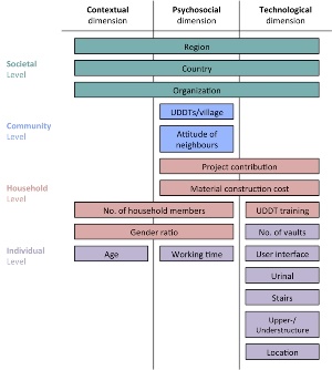 For each household an “Acceptance Score” was generated prior to this thesis, which is basically a quantitative reflection of the user acceptance (ranging from 1 - least accepted to 11 - best accepted). It is based on 9 indicators, including for instance smell appearance, cleanliness of the toilet or user satisfaction with the fertilizing effects of urine/faeces. In the frame of this thesis further data assessment took place to detect insufficiencies. In order to determine the effects of different factors (e.g. country or number of UDDTs per village) on the user acceptance score, methods from descriptive and inferential statistics were applied. Acceptance influencing factors were organised with the help of the IBM-WASH (compare figure 1). The IBM-WASH (Integrated Behavioural Model for Water, Sanitation, and Hygiene) aims to sort behavioural determinants. It is multi-levelled and -dimensioned introducing a contextual, technological and psychosocial dimension with determinants operating on following five levels: Societal, Community, Household, Individual and Habitual.