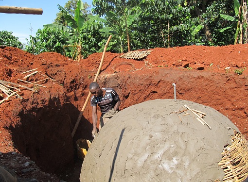 Mason (John) plastering biogas digestor in Ms. Nuriat Mukasa's home in Sekamalya village, Mulagi sub county