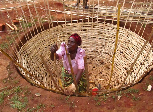Ms. Languida Elibanje participating in basket weaving at Mr. and Mrs. Ntege's home in Mugereka village, Mulagi sub county