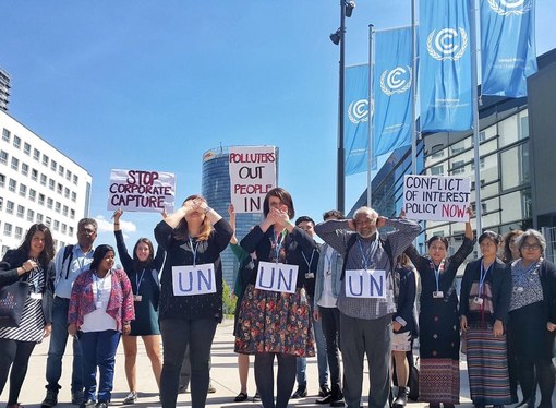 #UNFCCC Sec wont allow any action that calls out corporations #ConflictOfInterest in #sb46. We think it's ridiculous! #NoToCorporateCapture pic.twitter.com/VCrMa2MlQL