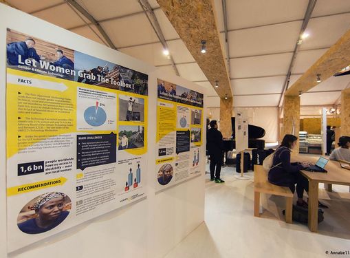 There is a huge complex open for the general public, filled with sustainable interventions, divided into different topical issues. We are located in the Gender & Climate section of the venue. With 6 educational posters, we guide our visitors on the main 6 points of the Paris Agreement, and how gender is related to theses issues. With a 3D model, located in the centre of the pavilion, we illustrate how these gender just solutions fit in to all different types of societies (rural, urban, north and south).
