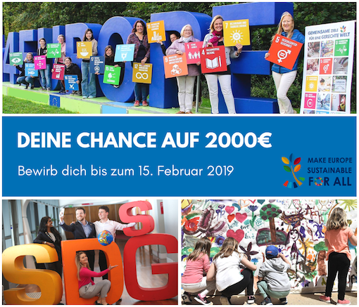 Wir vergeben im Rahmen unseres Projekts „Make Europe Sustainable for All“ dreimal 2.000 Euro als Unterstützung für lokale Aktionen, Kampagnen und öffentlichkeitswirksame Maßnahmen im Bereich "Nachhaltige Entwicklungsziele (SDGs)"