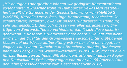 Für die Öffentlichkeit schafft HAMBURG WASSER mit einem neuen Infoportal ein Höchstmaß an Transparenz: Das Unternehmen stellt ab sofort alle Analyseergebnisse des hauseigenen Labors unter www.hamburgwasser.de/detailanalysen zur Verfügung.