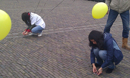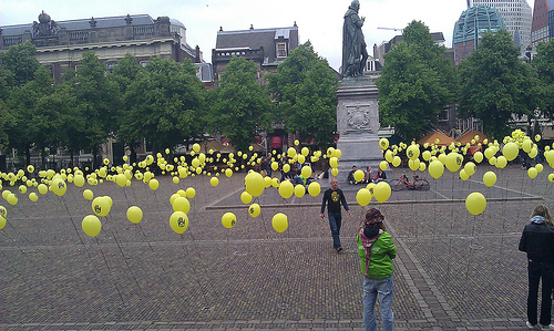 WECF's Marhaba Issak en Radostina Zasheva bevestigen ballonnnen voor de Tweede Kamer, foto's: cop. Greenpeace Nederland