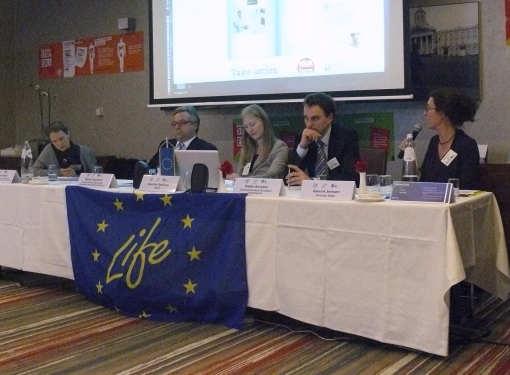 Van rechts naar links: Martine Rohl van het Belgische Ministerie, Martin Seychell van DG Sanco, WECF-Directeur Sascha Gabizon, Peter Korytar, DG Environment en Genon Jensen, Directeur van HEAL