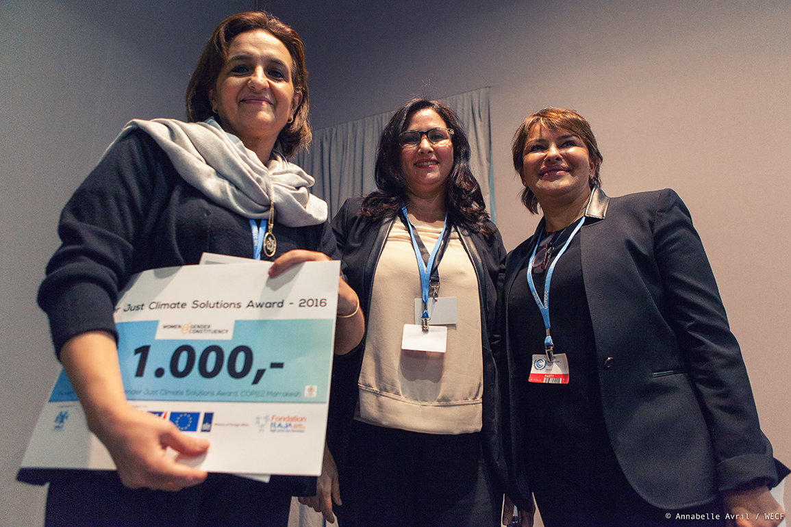 Gelanceerd in 2015, door de Women and Gender Constituency, eert de Gender Just Climate Award de fundamentele bijdrage van vrouwen in de strijd tegen de klimaatverandering en toont de relevantie van de integratie van gendergelijkheid in het klimaatbeleid. Maandag 14 november, tijdens de VN Klimaattop (COP 22) in Marrakech, Marokko, werd de prijs uitgereikt aan 3 vrouwenorganisaties die met hun klimaatoplossingen hebben aangetoond dat een rechtvaardige en duurzame toekomst mogelijk is.